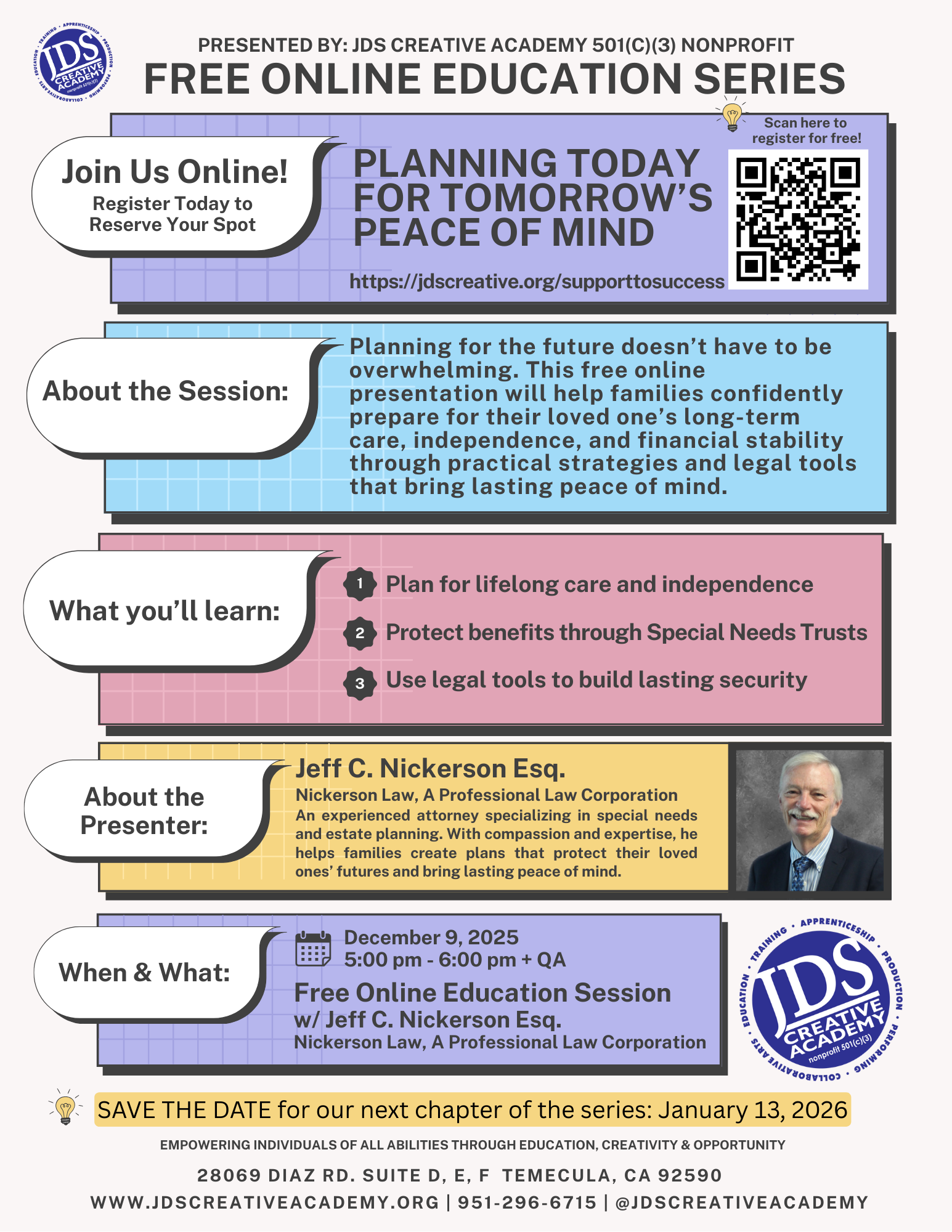 Continue building the tools and confidence you need to plan for your loved one’s long-term care, independence, and financial security. In this free virtual session, attorney Jeffrey C. Nickerson breaks down essential strategies for navigating Special Needs Trusts, preserving government benefits, choosing trustees, and avoiding common planning mistakes.